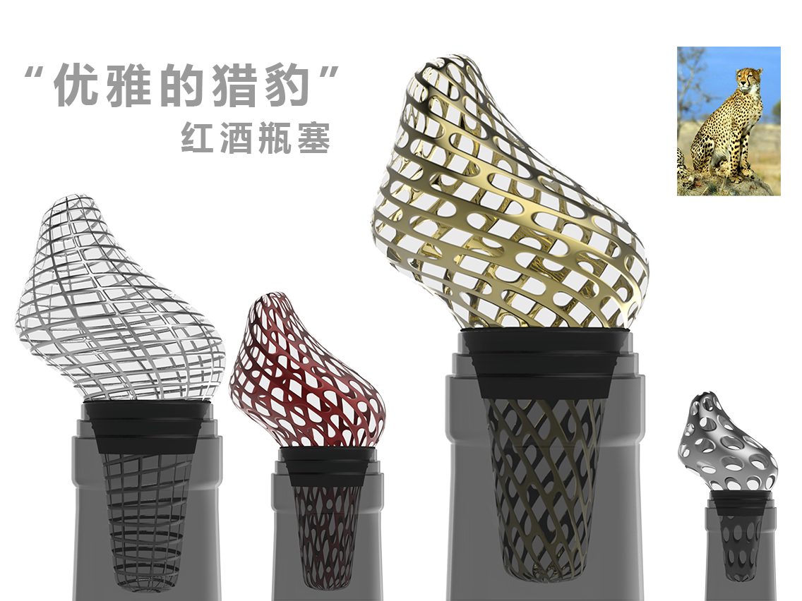 这是一款仿生猎豹的红酒瓶塞设计,表现了猎豹优雅的另一面;参数化的肌理赋予它简洁的外表上独特的形式美,与红酒的品味相得益彰。