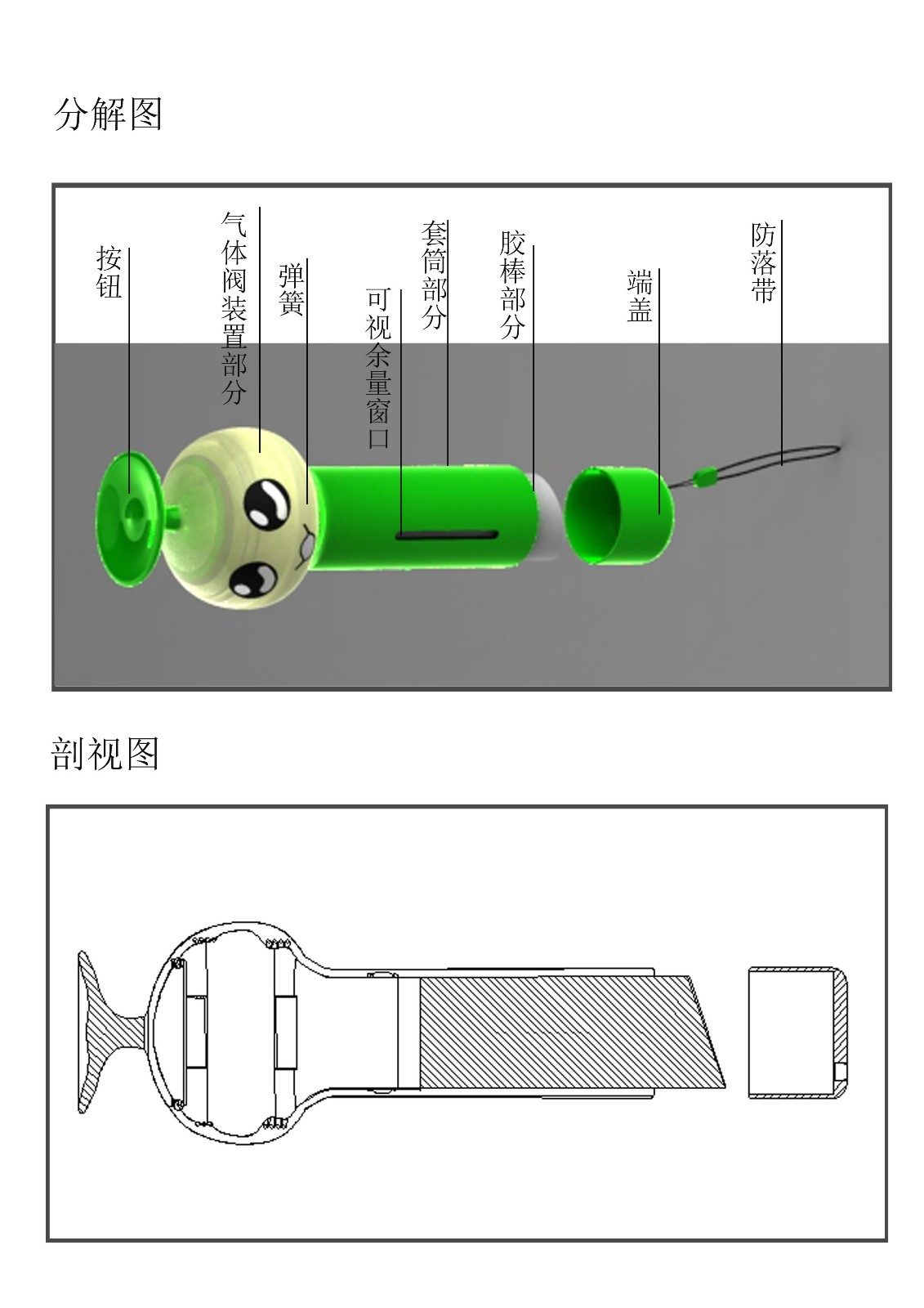 一种循环利用环保便利的办公用品装置,是一种经过改良的办公文具固体胶。该装置结构包含有端盖,胶棒加底座固结结构,套筒,弹簧,单向气体控制阀,按钮等几个基本零件。外力作用按下按钮,可推进胶棒下行,外力撤去,在弹簧作用下,按钮回复松开,其中单向气体控制阀用于控制在按钮按下和回缩时的关闭和打开,在不同情况下的使筒内外产生气压差,利用气压推动胶棒的进出工作,巧妙的解决了以往固体胶使用不便的情况。且设置了可替换式的胶棒体结构,解决了固体胶资源利用率不高的问题。外观设计符合人机工程学原理,新颖大方,便利生活,很有意义。
