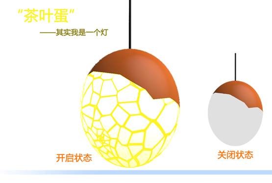 这是一款具有温暖氛围的吊灯,造型来源于茶叶蛋。茶叶罐表面有深深浅浅不规则的纹路,打开吊灯则能模拟出这种蛋纹的效果。