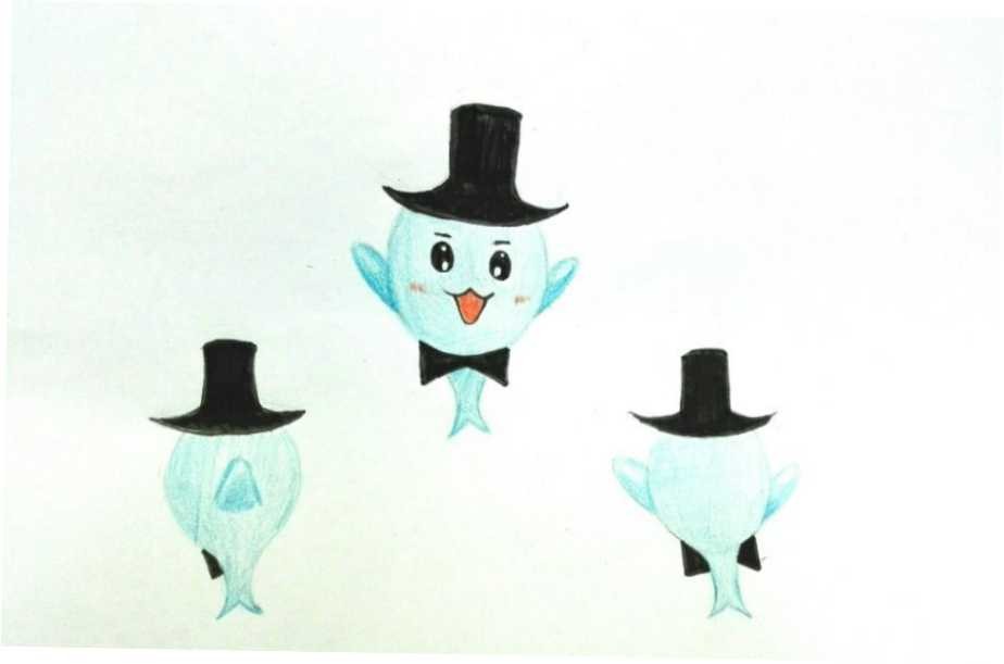 由由的主体造型是鲸鱼,头戴着一顶黑色绅士帽,身配一个黑色领结,双手打开打开 呈拥抱欢迎的姿态。